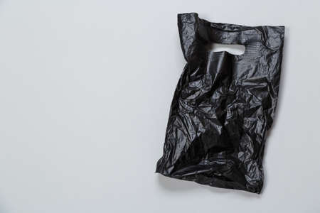 close up of used black plastic disposable bag on gray background