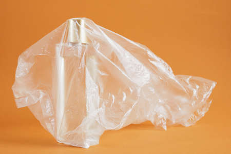 bottle of perfume in a plastic bag on a brown background, original idea, copy space eco friendly and no plastic concept