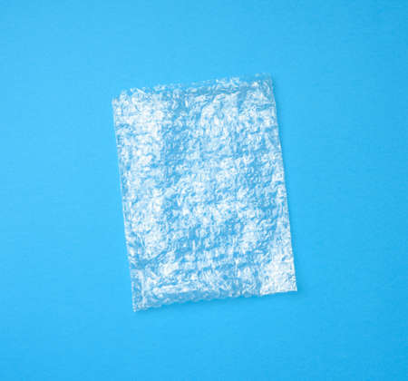blank transparent plastic bag with air bubbles on blue background, top view