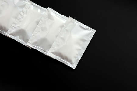Blank white sachet packets stack mockup isolated on black background. Empty airtight pack mock-up for sauce, coffee, wet wipe, mayonnaise.