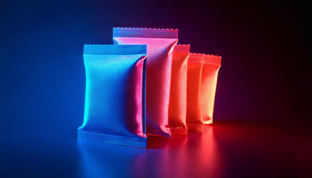 Neon-colored packaging of chips displayed in various sizes, creating a striking visual contrast.