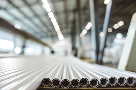 PVC plastic construction pipes for water are displayed in row on counter. Blur background