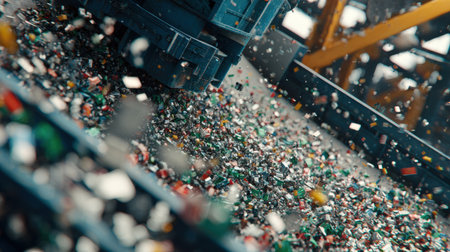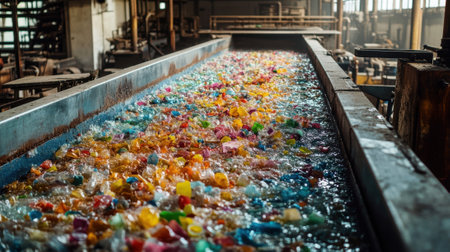 Colorful glass fragments flow along a mechanized strip in a recycling plant, under intense overhead lighting with a faintly obscured workspace in the distance.