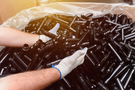 hands in gloves sort pellets and cardboard, inspecting recycling process with bottles and jars nearby