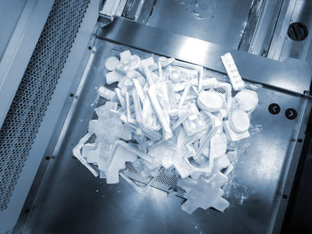 Objects and models printed on industrial 3D printer from white plastic powder in laboratory. Raising work surface. Multi Jet Fusion MJF 3D printing. New technologies 3D printer