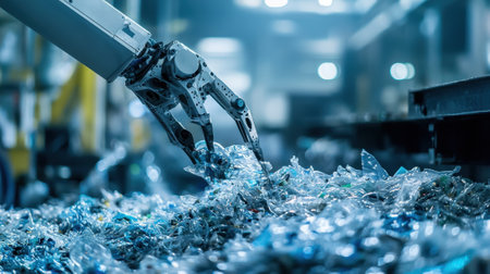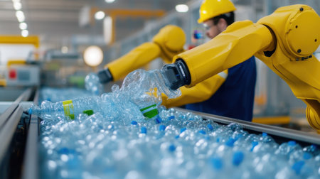 Robotic arms operating in a factory, picking up and sorting numerous plastic bottles on a long conveyor belt, highlighting modern waste management technology and industrial automation processes