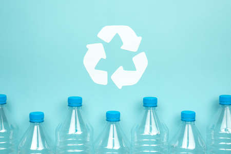 Horizontal color image with an overhead view of a clear plastic bottles with caps on a blue background. Recycling and environment concept.