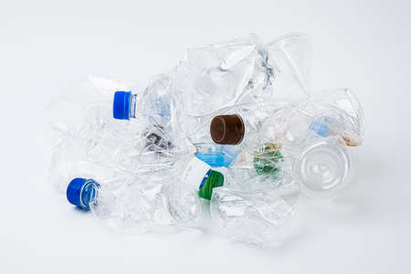 Crushed or crumpled clear plastic bottles. Plastic waste. Plastic recycling. Plastic pollution and waste management.