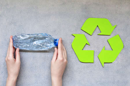 Woman hands holding plastic bottle with recycle symbol on gray background.