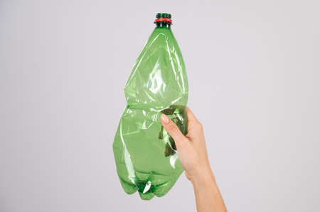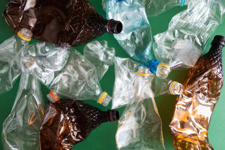 Used rumpled plastic bottle on green background. Ecology problem. Top view, copy space. Plastic trash.