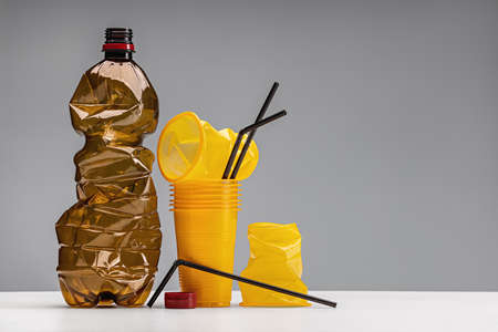 Used plastic, gray background. Disposable cups, drinking straws and a bottle. The concept of ecology and recycling.