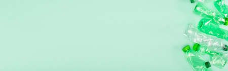 Panoramic shot of crumpled plastic bottles on green surface, ecology concept