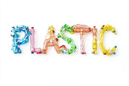 Colorful plastic bottles have been cleverly shaped to form the word plastic, emphasizing the importance of recycling and environmental awareness. This artwork promotes sustainability.
