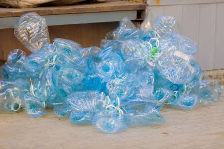 Used empty crumpled plastic bottles on blue background. Recycling recycled plastic. Pollution, environmental protection.