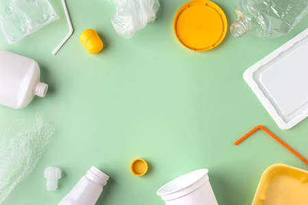 Plastic waste for recycling and reuse. Ecological concept. Frame, flat lay, copy space