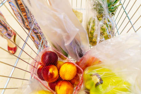 Female customer with shopping cart trolley at supermarket self service grocery shop. Fruits and vegetables inside. Retail.