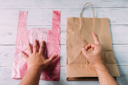 Male hands on the background of the table close-up show that a paper bag is better than a plastic bag