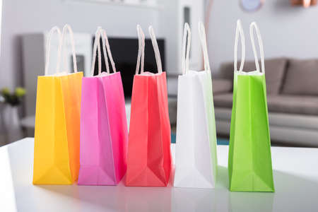 Close-up Of Multi Colored Shopping Bags On White Desk