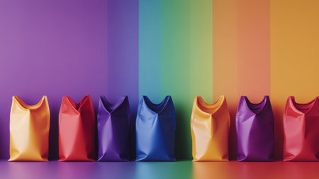 A vibrant arrangement of colorful shopping bags against a rainbow background, showcasing a playful and modern aesthetic perfect for retail and marketing.
