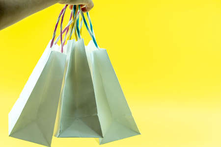 Cropped shot of female hand holding bunch of different colorful blank shopping bags over isolated Yellow background. Black friday sale concept. Copy space, close up.