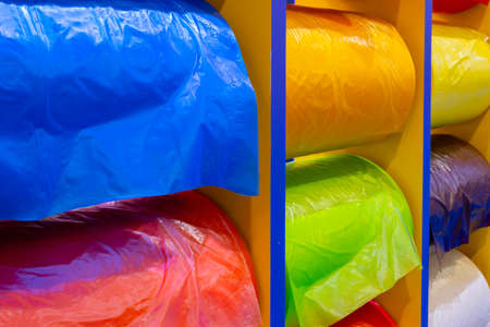 Multicolor rolls of polyethylene film in stock. Modern warehouse and storage systems.