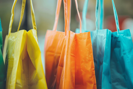 Various brightly colored shopping bags are hung in the sales area