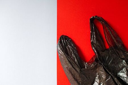 Black garbage bag roll on red and gray background. Ecological concept. Place for the inscription.