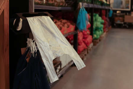Plastic bags near rack with fruits in supermarket, space for text