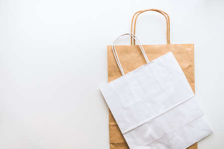 Craft and white eco friendly paper bags isolated on white background with copy space. High quality photo