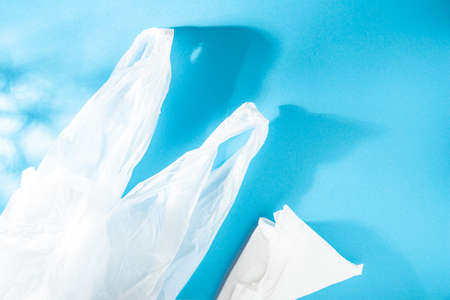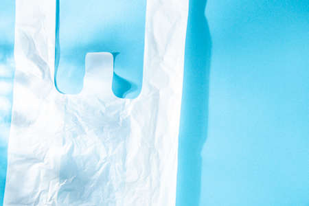 White plastic bag on blue background. Copy space
