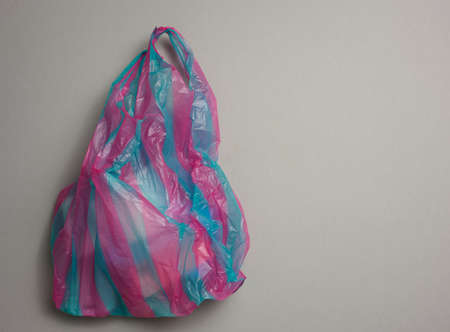 Used polyethylene plastic bags in bright background. Plastic waste, excessive production of single use plastic bags concept