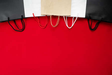 Several shopping bags with copy space on red background