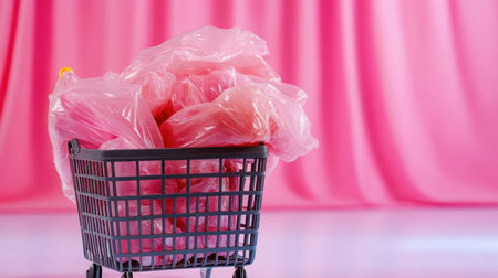 Small grocery cart filled with plastic bags spilling over on vivid pink studio backdrop