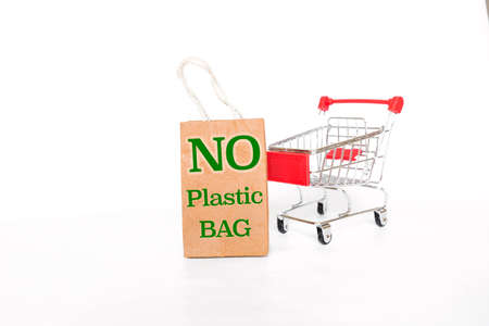 No plastic bag sign on paper shopping bag with empty shopping cart on white background, business object