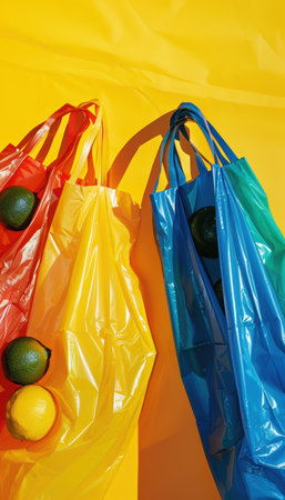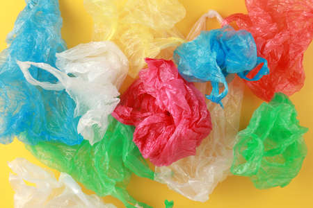 Colourful plastic bags on yellow background.