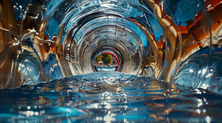 A stunning view of a vibrant water slides tunnel, showcasing brilliant colors along with rippling water