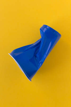 Used plastic cup on bright yellow background. Environment, Plastic pollution and resource conservation concept.