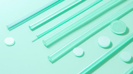 A visually striking arrangement of transparent green glass straws and circular discs set against a light mint background, emphasizing eco-friendly design.