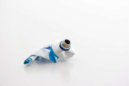 Used up squeezed out metal paste tube ready for recycling close up studio shot isolated on white.