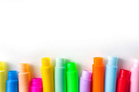 Modern trendy kids fidget finger toys, relaxation concept - set of different bright colorful pop-tubes, on white background, top view copy space