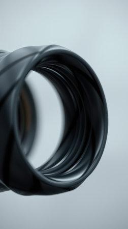 Abstract black spiral swirl inside a big shiny metal pipe, cold blue toned black and white
