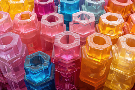 Colorful toy bricks with unique textures and interlocking designs create playful patterns