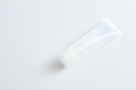 Top view blank label facial skincare tube bottle with lid open on blue background. Space for text