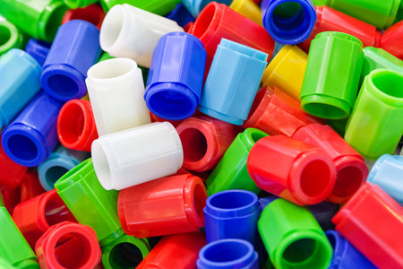 Large assortment of multicolored plastic parts, abstract industrial production or recycling background