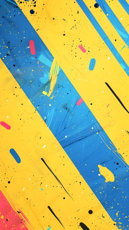 This captivating abstract image presents a visually stunning explosion of vibrant colors and dynamic fluid shapes The composition features a harmonious blend of blues yellows and splashes of red