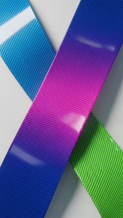 Three intersecting strips of carbon fiber with a vibrant blue to pink gradient and a bright green strip, all with a glossy finish on a clean white background.