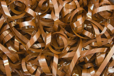 Reel of an old VHS videotape seen up close against a yellow background and meters of magnetic tape around it