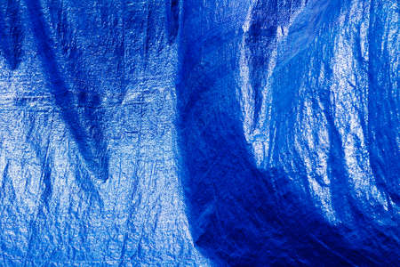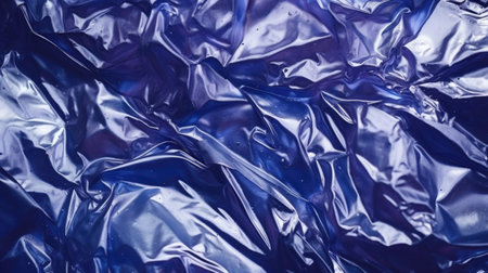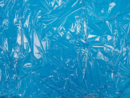 Extreme close up of blue empty plastic bag background. The plastic surface is wrinkly and tattered making abstract pattern. Selective focus, shallow depth of field.