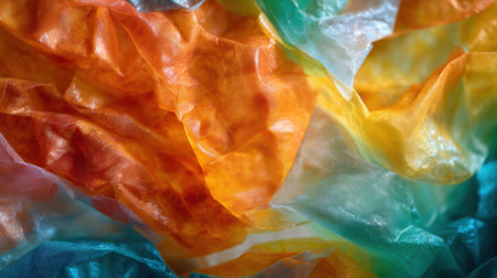 This image showcases colorful crumpled plastic sheets in shades of orange, yellow, green, and blue. Ideal for creative projects, backgrounds, or textures.