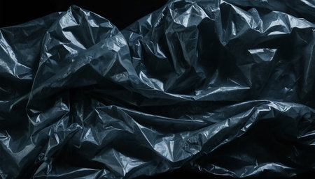 Black wrinkled plastic wrap texture. Crumpled dark thin plastic background. Generative AI.
